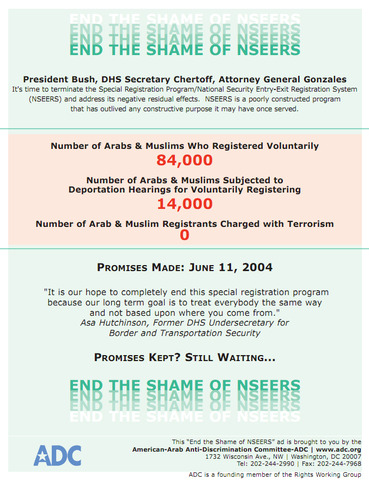 NSEERS Timeline By adcnational Dec 23, 2002 Letter from US Senators and Congressman Demanding former Attorney General John Ashcroft Suspend INS Special Registration Senators and Congressman Demand Ashcroft Suspend INS Special Registration Period: Dec 23, 2002 to Apr 29, 2011 NSEERS Timeline Apr 3, 2006 Letter to US Department of Homeland Security Letter to US Department of Homeland Security Oct 17, 2006 ADC Files Lawsuit against DHS and ICE Concerning the “October Plan” ADC Files Lawsuit Against DHS and ICE Concerning the “October Plan” Dec 13, 2006 Letter from the National Network of Arab American Communities detailing the impact of NSEERS on the community and supporting ADC‘s work on this issue Letter from the National Network of Arab American Communities detailing the impact of NSEERS on the community and supporting ADC‘s work on this issue Jan 1, 2007 Letter from the US Senate Committee on the Judiciary to DHS Secretary Chertoff calling for the termination of NSEERS Letter from the US Senate Committee on the Judiciary to DHS Secretary Chertoff calling for the termination of NSEERS Jan 9, 2007 ADC Raises Concerns with Attorney General ADC Raises Concerns with Attorney General Mar 28, 2007 ADC Launches “End the Shame of NSEERS” Ad Campaign ADC Launches “End the Shame of NSEERS” Ad Campaign Apr 1, 2007 Letter from the US Senate Committee on the Judiciary to DHS Secretary Chertoff calling for the termination of NSEERS Apr 17, 2007 “End the Shame of NSEERS” Ad Campaign Gains Momentum “End the Shame of NSEERS” Ad Campaign Gains Momentum Jul 26, 2007 When will the “Shame of NSEERS” End? When will the “Shame of NSEERS” End? Dec 7, 2007 ADC Raises Concerns with Attorney General Mukasey ADC Raises Concerns with Attorney General Mukasey Oct 20, 2008 ICE Targets Immigrants from Muslim Majority Countries Prior to 2004 Presidential Election ICE Targets Immigrants from Muslim Majority Countries Prior to 2004 Presidential Election Mar 31, 2009 NSEERS: The Consequences of America’s Efforts to Secure Its Borders NSEERS Paper Jul 1, 2009 Immigration Reform and NSEERS Immigration Reform and NSEERS Sep 16, 2009 Letter to Inspector General Skinner Letter to Inspector General Skinner Sep 17, 2009 Over 40 Organizations Send Letter to DHS Inspector General Calling for NSEERS Audit Over 40 Organizations Send Letter to DHS Inspector General Calling for NSEERS Audit Nov 19, 2009 Press Release: Office of Inspector General at DHS to Audit NSEERS at the Request of ADC and Other Major Organizations Press Release: Office of Inspector General at DHS to Audit NSEERS at the Request of ADC and Other Major Organizations Jun 29, 2010 Press Release: ADC Continues to Call for the Termination of NSEERS Press Release: ADC Continues to Call for the Termination of NSEERS Apr 27, 2011 Advocacy Organizations Welcome DHS Policy Change Regarding NSEERS Advocacy Organizations Welcome DHS Policy Change Regarding NSEERS