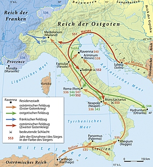 Totila wurde vom Militär zum neuen Kaiser ernannt und kämpfte daraufhin ebenfalls zunächst erfolgreich um die Rückeroberung Italiens, starb dann jedoch in der Schlacht