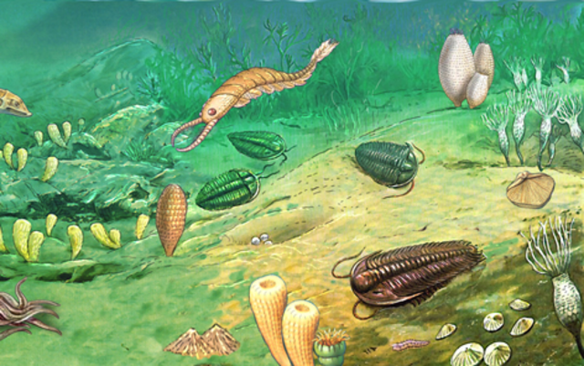 Els primers ammonits (mol·luscs) van aparèixer,i els trilobits,els braquiòpodes semblants als mol·luscs,així com els grans esculls de coralls,encara eren comuns.