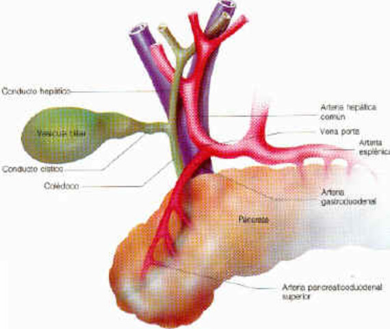 Vías biliares Extrahepáticas.- se resumen en dos conductos hepáticos derecho e izquierdo, que emergen del hilio y se reunen debajo de éste: Aquí comienzan las vías biliares extrahepáticas que comprenden la Vía Biliar Principal y la Vía Biliar Accesoria. Los dos conductos hepáticos se reunen para formar el Conducto Hepatico, segmento inicial de la vía biliar principal. El conducto hepático recibe, la vía biliar accesoria.
