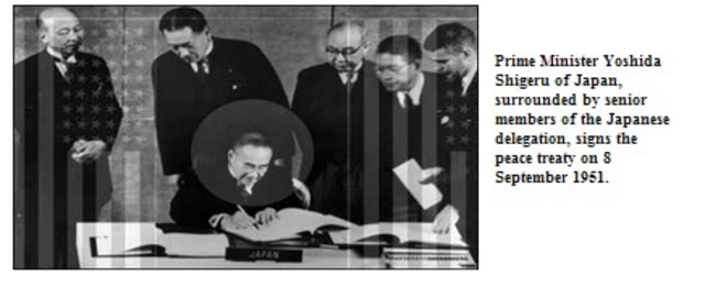 Image of the Prime Minister, Yoshida Shigeru of Japan, signing the Treaty of San Francisco (1951). It made use of the Charter of the United Nations (1945), with some of its religious clauses. This treaty, states that properties which belong to “religious bodies or private charitable institutions” must be used exclusively for religious purposes. Essentially, property rights of religious minorities, in Japan were protected and civilians had the right to remain in their desired institutions.