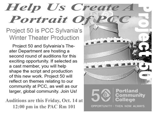 Feedback session from PCC community 12-2 pm; Information Session for those intrested in Audition 2-3 pm; Audition 3-5 pm