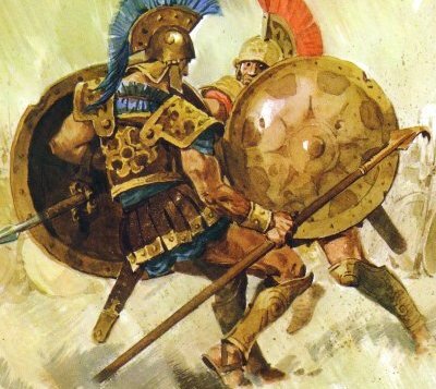 ETTORE E ACHILLE COMBATTONO: I DUE EROI SONO MOLTO FORTI MA AD UN TRATTO LA LANCIA DI ACHILLE COLPISCE A MORTE IL COLLO DI ETTORE. -