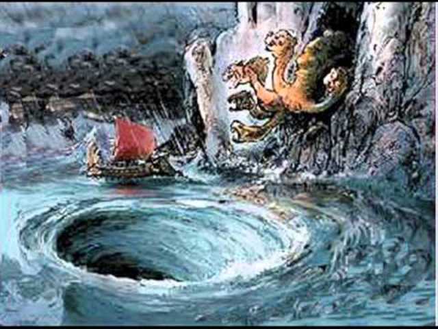 Scylla and Charybdis. Syclla is a six-headed monster who shows the evil side by swallowing at least one poor sailor from each ship. Charybdis is a big natural disaster (whirlpool) who somehow intimidates the men on the ship into thinking that it’s going to swallow them. Odysseus loses at least six of men which brings him down to a lowered number because in the previous stories he lost men.