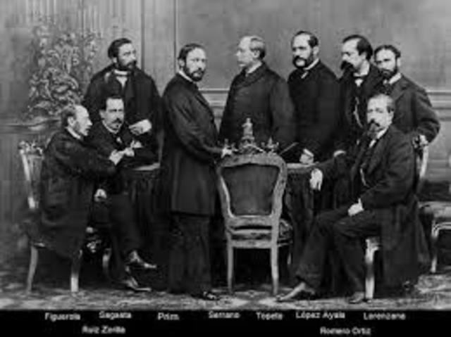 y progresistas respectivamente, decretaron la disolución de las juntas y asumieron el ideario democrático de estas.Prim pasa a ser nombrado jefe de gobierno y Serrano es declarado regente. Durante este periodo se creo la peseta; hubo un intento de refora fiscal, mas tarde rechazada; se dictó una nueva legislación minera y por ultimo se introdujo el librecamismo. -