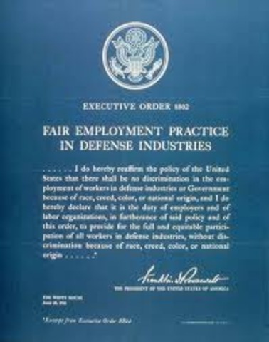 ''opening jobs and job training programs in defense plants to all Americans “without discrimination because of race, creed, color, or national origin.” This was the year a million jobs were given. This was brought in order by Franklin Roosevelt.