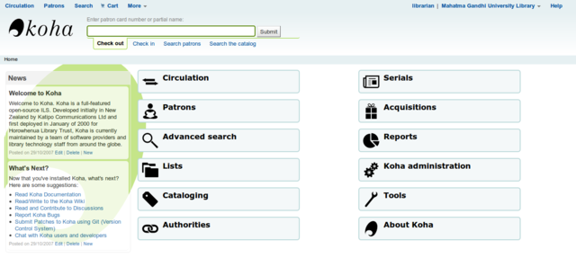la gestión bibliotecaria. Contiene la mayoría de módulos anteriormente citados y su OPAC en