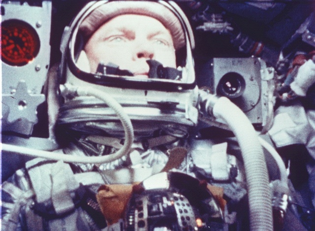 John Glenn was the frist American to eat in space. He is eating apple sauce through a tube, and xylose sugar in water, he did this to prove that you can eat, swallow and digest food in a weightless enviroment.