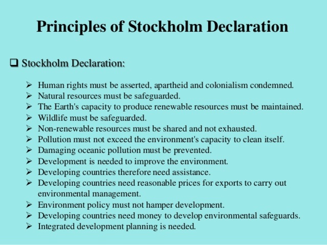The Declaration of the United Nations Conference on the Human Environment, or Stockholm Declaration, was adopted June 16, 1972 by the United Nations Conference on the Human Environment at the 21st plenary meeting as the first document in international environmental law to recognize the right to a healthy environmen