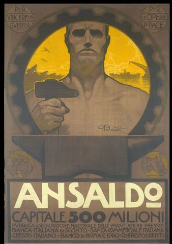 Venne nuovamente colpita la stabilità finanziaria dell'Ansaldo perché non poteva più esportare per l'italianità che obbligava il fascismo, rendendo meno competitiva l'azienda. Manifesto nell'immagine del 1938