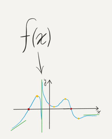 Analyse the behaviour of the function near the accumulation points of its domain where it is not continuous or undefined by means of limits