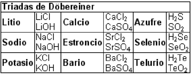 Br tenia propiedades que aparecían a la mitad entre el Cl y I, y encontró lo mismo para Ca, Sr, Ba y S, Se y Te. Llamó triadas. Confusión entre peso atómico y molecular.