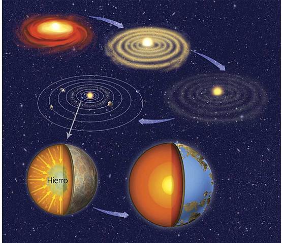 Explica que los planetas y otros cuerpos celestes se forman mediante la condensación de pequeñas partículas de polvo, atraídas por la fuerza de gravedad. La idea de que los planetas se forman así fue presentada por el geofísico ruso Otto Schmidt en 1944; propuso que una enorme nube de gas y polvo, en forma de disco aplanado, rodeaba al Sol en los comienzos del sistema solar.