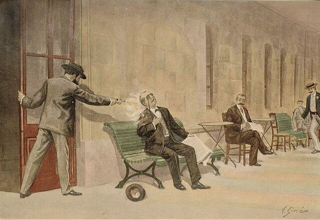 El 25 de octubre, cuando ALFONSO XII se encontraba delante de la farmacia en la que había sido citado, un tonelero catalán, llamado JUAN OLIVA MONCUSÍ, levantó el revólver y le propinó dos disparos, los cuales no llegaron a impactar en su cuerpo. OLIVA, que había acudido expresamente a la capital una semana antes para cometer el atentado, contaba con 23 años de edad en el momento del suceso. -