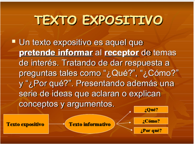 Un texto expositivo es aquel que pretende informar al receptor de temas de interès. Tratando de dar respuestas a preguntas tales como: ¿Que? ¿Como? y ¿Porque?. Presentando ademas una serie de ideas que aclaran o explican conceptos y argumentos.