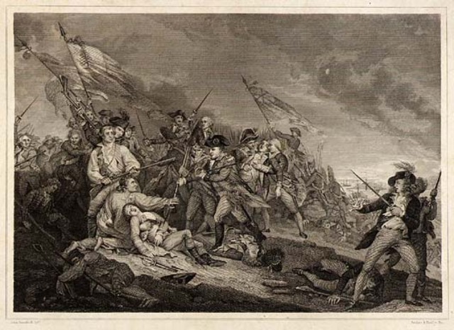 VIP-Bitish , john stalk , william prescott The Battle of Bunker Hill took place on June 17, 1775, mostly on and around Breed's Hill, during the Siege of Boston early in the American Revolutionary War. The battle is named after the adjacent Bunker Hill, which was peripherally involved in the battle and was the original objective of both colonial and British troops, and is occasionally referred to as the "Battle of Breed's Hill."