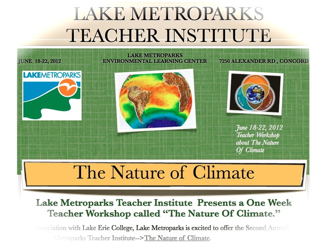 The Nature Of Climate Timeline By richardbenz Jun 18, 2012 Monday - Nature Of Climate Intro Monday--Intro to Climate Period: Jun 18, 2012 to Jun 22, 2012 The Nature Of Climate Teacher Institute The Lake Metroparks Teacher Institute--The Nature Of Climate Jun 19, 2012 Tuesday - Climate On the Farm Tuesday-Climate On the Farm Jun 20, 2012 Wednesday - Climate and the Lake Effect Wednesday - Climate and the Lake Jun 21, 2012 Thursday - Climate in Micro-scale and Aloft Thursday - Climate In Micro scale-and Aloft Jun 22, 2012 Friday - Climate In the Curriculum Friday - Climate In the Curriculum
