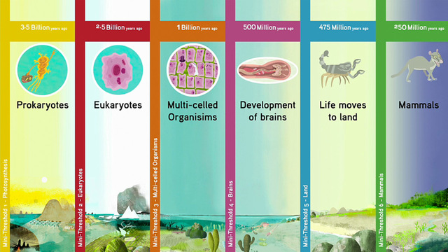 600 - 540 million years ago, multi-celled organisms started to be formed from the combining and specialising of eukaryotic cells. All the cells in the organisms had the same DNA, but they all used different parts of the DNA's code to form cells such as neurons, bone cells and muscle cells (this evolution may have been made possible by an increase in atmospheric oxygen). They eventually evolved to survive on dry land.