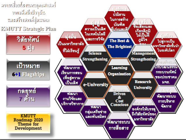 ถอดแผน Roadmap 2020 เป็นแผนพัฒนาเชิงกลยุทธ์ มจธ. ฉบับที่ 10 (2550-2554) มีเป้าหมายหลักในการพัฒนา6 ด้าน
