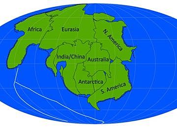 Postula que cada 400-500 millones de años todas las masas de tierra emergidas se unen, formando un supercontinente. El desplazamiento de las placas se realiza sobre una superficie esférica, por lo que los continentes chocan y se sueldan formándose una gran masa continental, un supercontinente. Pangea
