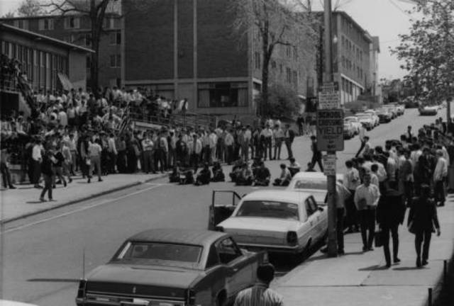 68 students engage in peaceful demonstration to protest Nixon's "inhuman" policies regarding the Vietnam war.