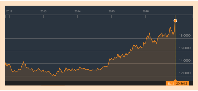 El Republicano Donald J. Trump gana la presidencia de los Estados Unidos, causando una enorme incertidumbre dentro del mercado y particularmente para México. El valor del dólar explota y el peso pierde más del 10% de su valor en un par de días. Al cierre del mercado el 11 de Noviembre del 2016 el dólar se cotiza a $20.832 pesos por cada dólar. Más del doble de lo que estaba hace diez años, indicando una pérdida del 50% del valor del peso mexicano en una década.