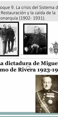 Unidad 9: La crisis del sistema de la restauración y la caída de la monarquía (1902-1931). La dictadura de Primo Rivera (1923-1930) By Inmaa 1856 Crisis de subsistencia Period: May 17, 1886 to Apr 14, 1931 Reinado de Alfonso XIII 1902 Iniciado reinado Alfonso XIII 1902 Dictadura de Primo de Rivera 1906 Ley de jurisdicciones Apr 7, 1906 Conferencia de Algeciras 1907 Leyes de administración local y electoral Period: 1907 to 1909 Gobierno largo de Antonio Maura Jan 6, 1908 Formación del partido radical 1909 Semana trágica 1910 Fundación de la CNT 1910 Ley del candado Period: 1910 to 1912 Gobierno de José Canalejas Mar 30, 1912 Protectorado de España y Francia sobre Marruecos Nov 12, 1912 Asesinato de Canalejas Period: 1913 to 1921 Gobierno de Eduardo Dato 1914 Mancomunidad de Cataluña 1917 Juntas de defensa Dec 1, 1917 Fundación de la unión aragonesista Dec 1, 1917 Fundación de la unión aragonesista 1921 Desastre de Annual Mar 8, 1921 Asesinato de Eduardo Dato Nov 14, 1921 Creación del PCE 1922 Expediente Picasso Period: Sep 15, 1923 to Dec 3, 1925 Dictadura de Primo de Rivera: Directorio militar 1924 Fundación de la unión patriótica 1925 Directorio civil Period: 1925 to 1930 Dictadura de Primo de Rivera: Directorio Civil May 27, 1927 Fin de la guerra de Marruecos 1930 Gobierno Berenguer Aug 17, 1930 Pacto de San Sebastián 1931 Gobierno de Aznar