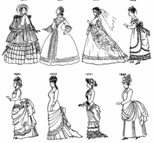 Women's dress featured tight fitted vests with very narrow sleeves and high necklines, with white ruffles at the wrist. At the beginning of the decade the emphasis was at the back of the skirt. The skirt featuring peplum, and adornment such as bows and thick fabrics.The middle of the decade saw a brief revival of the bustle, which was so exaggerated. By the end of the decade the bustle disappeared. Hair was worn in tight, close curls on the top of the head. Hats and caps were small and neat.